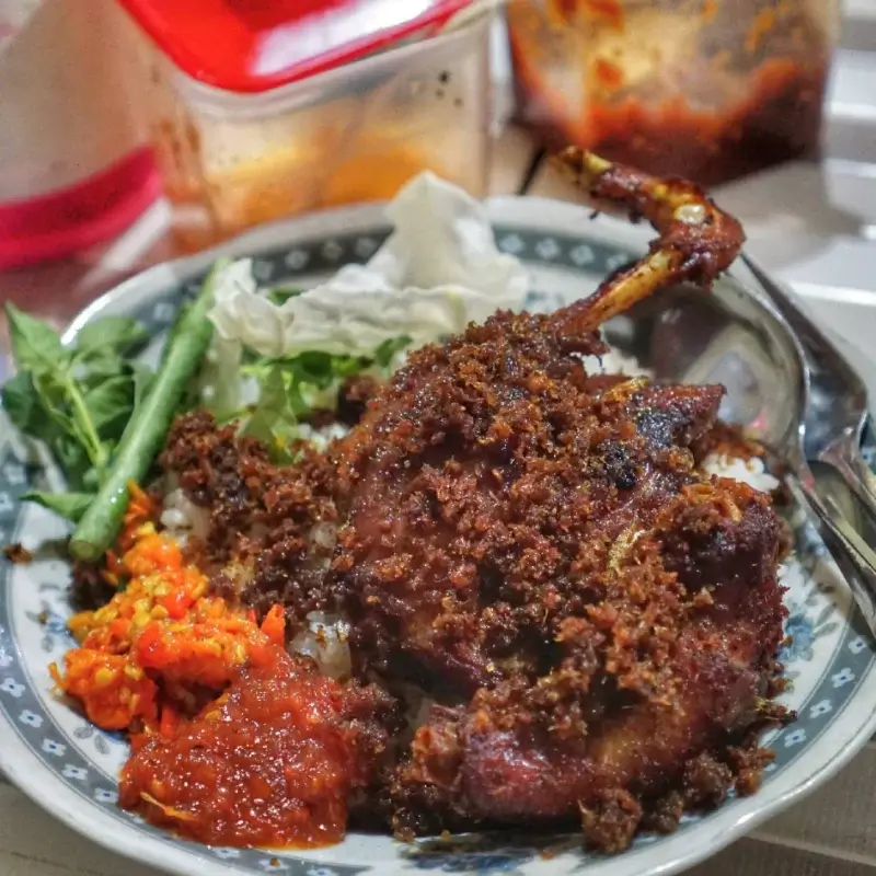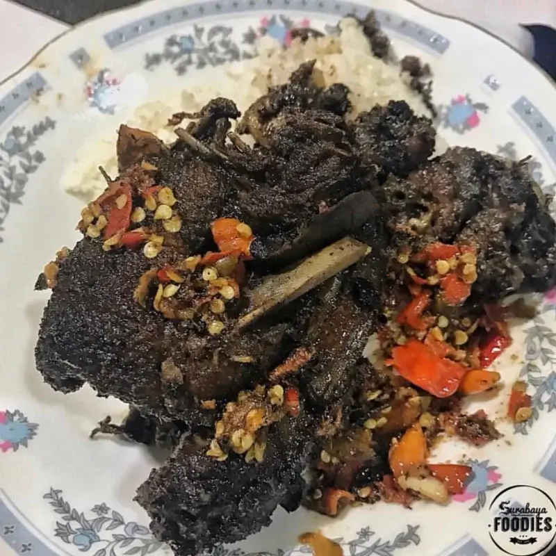 Bebeknya digoreng kering dengan warna gelap kehitaman, namun rasanya gurih dan sedikit smoky. Tak heran jika tempat ini sering disebut-sebut sebagai salah satu kuliner malam Surabaya paling populer karena jam bukanya yang hingga larut malam.