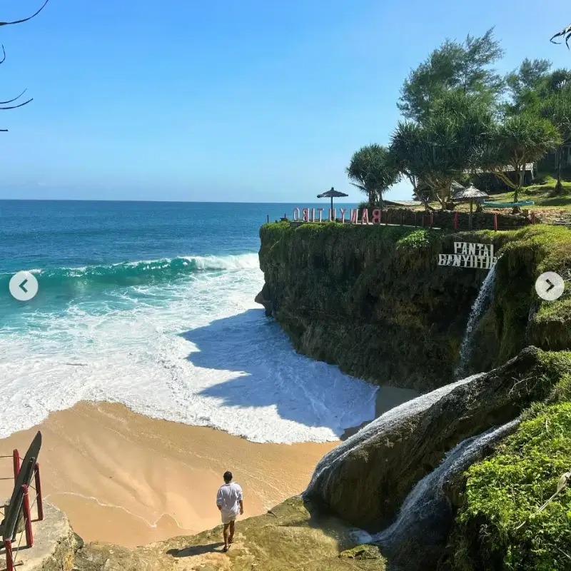 Nama “Banyu Tibo” berarti air yang jatuh, dan sesuai namanya, pantai ini memiliki air terjun alami yang langsung mengalir ke laut. Fenomena ini menjadikannya salah satu destinasi wisata alam Pacitan paling unik. Saat air laut sedang surut, Anda bisa bermain air di bawah air terjun, namun ketika pasang sebaiknya menikmati pemandangan dari atas tebing.