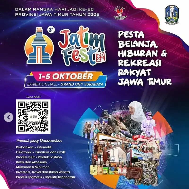 Masih di Grand City, Jatim Fest 2025 hadir lebih awal, tepatnya pada 1–5 Oktober 2025. Acara ini diselenggarakan dalam rangka memperingati Hari Jadi ke-80 Provinsi Jawa Timur. Mengusung tema “Pesta Belanja, Hiburan, dan Rekreasi Rakyat Jawa Timur,” Jatim Fest menjadi pameran multiproduk terbesar di Jawa Timur dengan ratusan tenant dan berbagai aktivitas menarik.